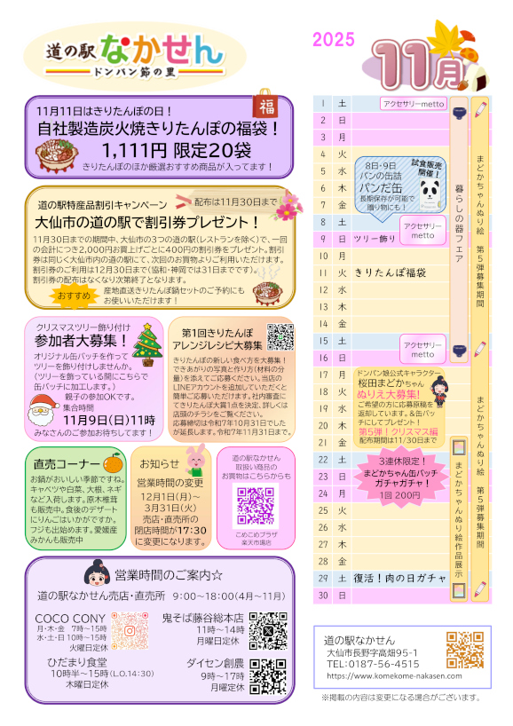 11月は“きりたんぽの日”福袋やクリスマスツリー飾り付けなどがあります。みなさまのご来店お待ちしております。