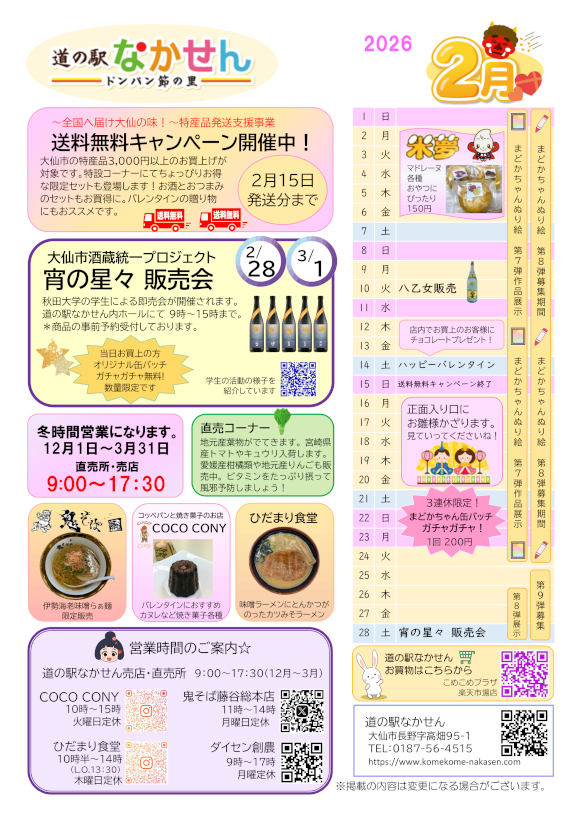 12月は “大仙市の特産品 送料無料キャンペーン” が始まります。1件につき3,000円以上のお買物で送料無料で発送できます。きりたんぽ鍋セットをはじめ、地酒やいぶりがっこなどが対象になります。鬼塩らぁ麺や新発売の炙り鬼味噌らぁ麺も送れます。お米やお野菜は対象外です。ご了承くださいませ。発送期間は12月1日~2026年2月15日まで。