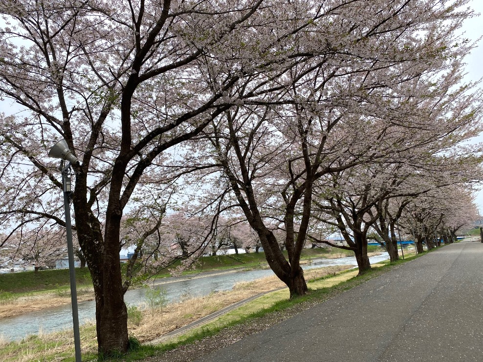 曇り空です。少し葉が出てきました。地面にもはらはらと桜の花びらが落ちていました。